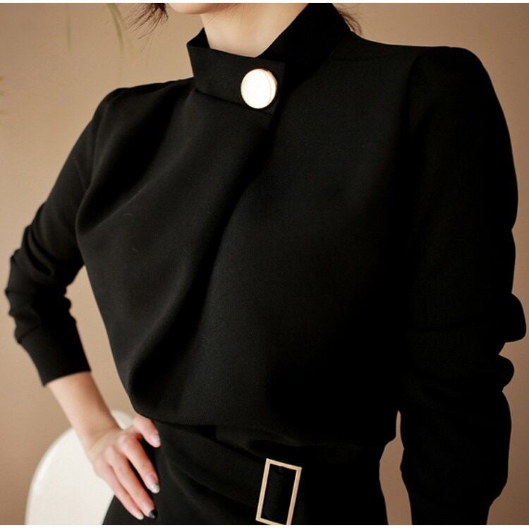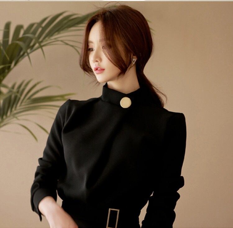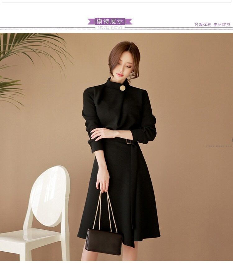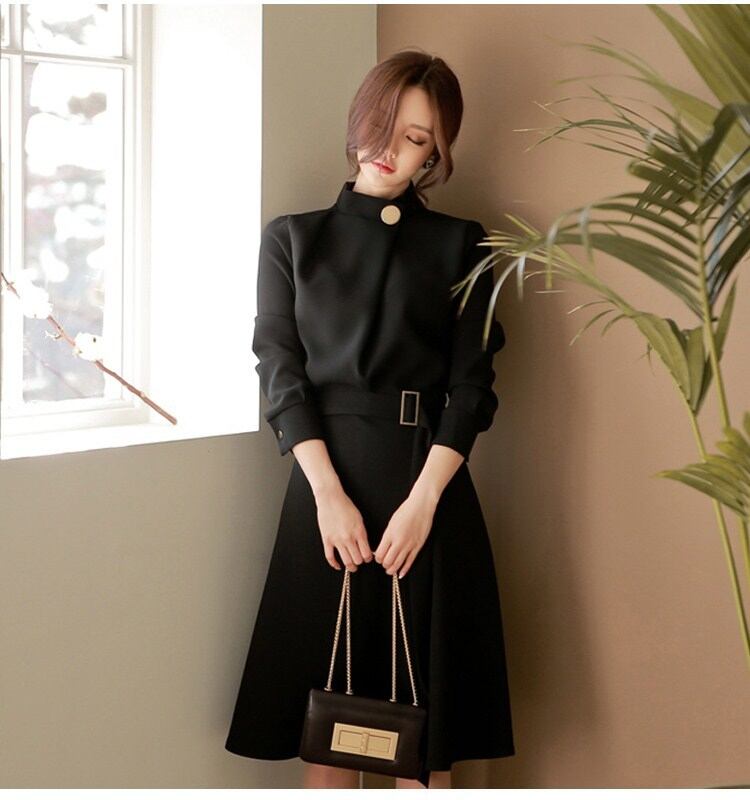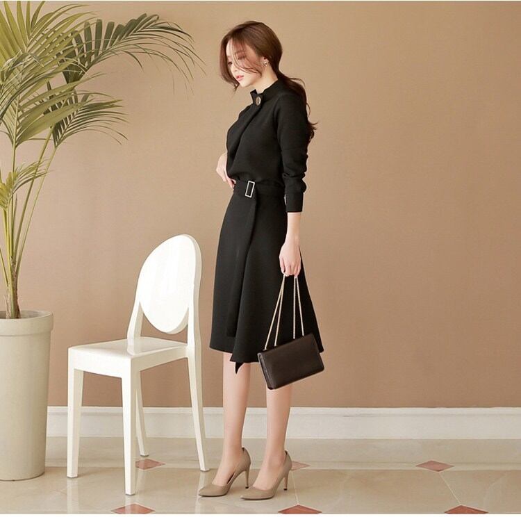 ベルト ビジネス 結婚式 秋 冬 ひざ丈 韓国 長袖 無地 Aライン 韓国 秋 ワンピース 卒業式 コットン ワンピース 二次会 ビジネスガール [nini0013] | poillypecoraワンピースストア
