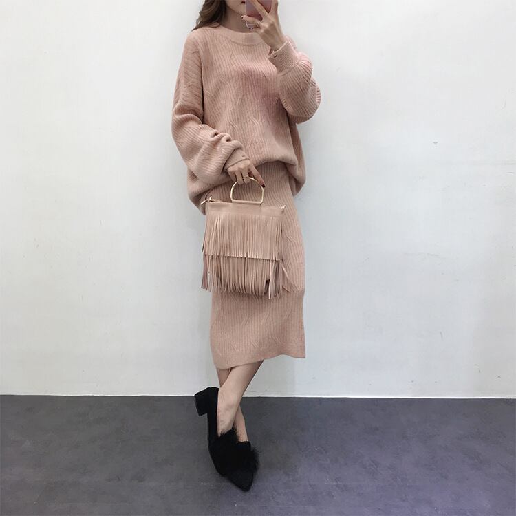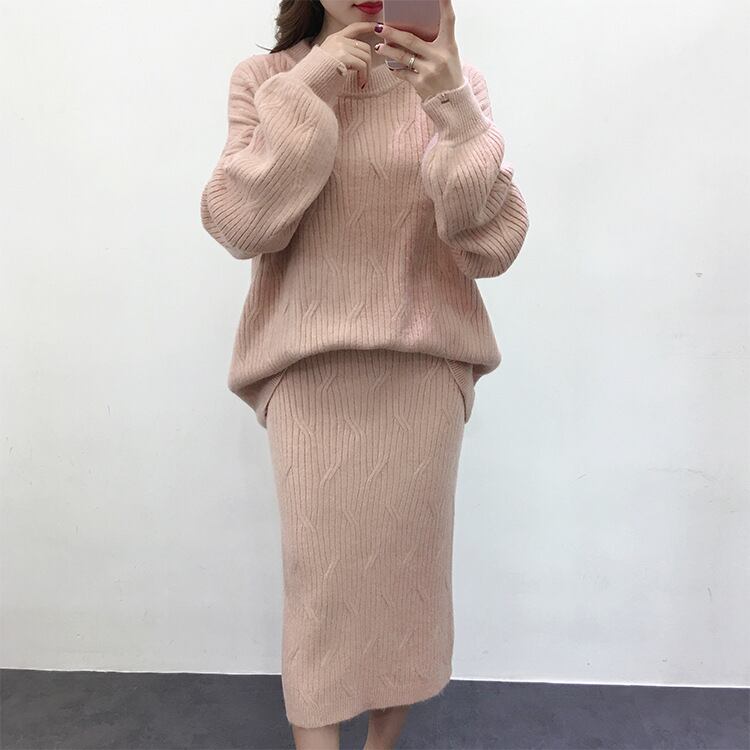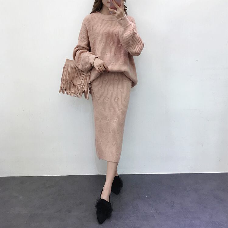 ワンピース ロング丈 ニット セットアップ 伸縮 ラウンドネック プルオーバー トップス スカート 大人 おしゃれ 上品 無地 カジュアル 冬 着痩せ [ueno0053] | poillypecoraワンピースストア